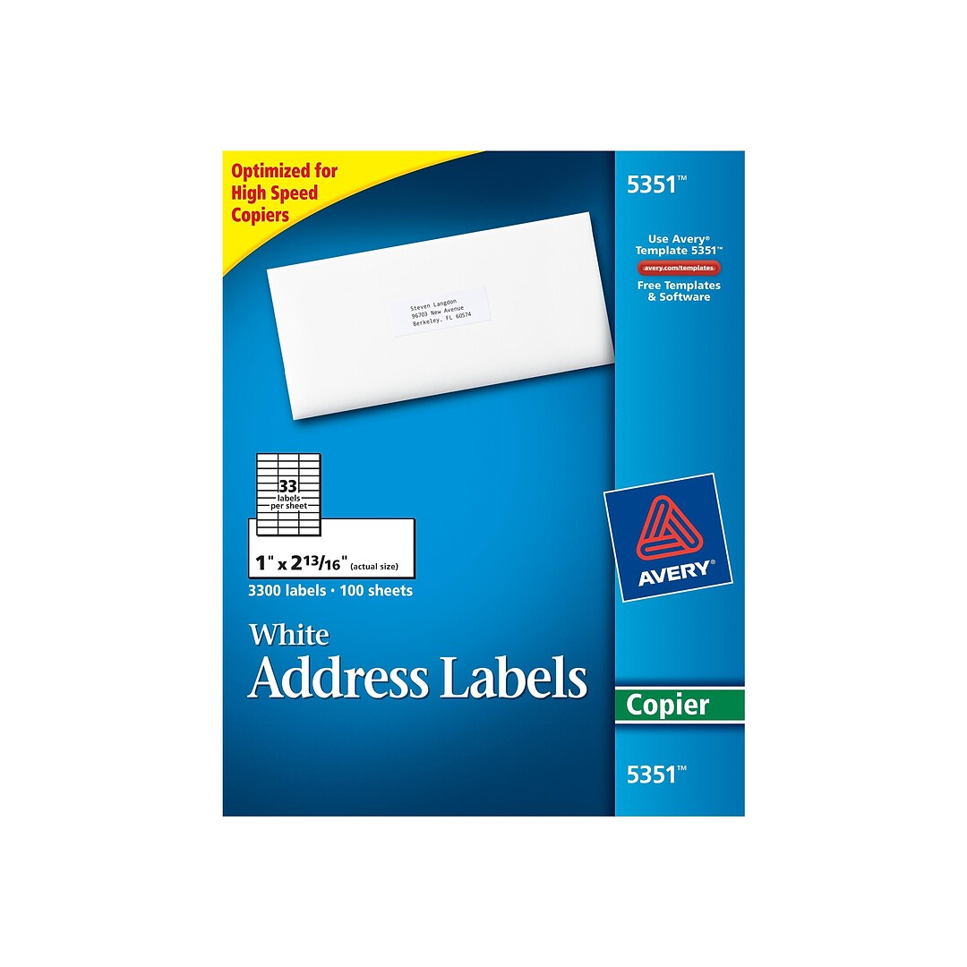 Avery® Copier Address Labels - 1 1/2" Width x 2 13/16" Length - Permanent Adhesive - Rectangle - White - Paper - 21 / Sheet - 100 Total Sheets - 2100 ...